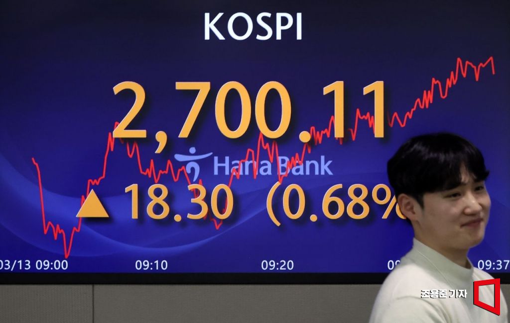 코스피가 전 거래일 대비 18.30포인트(0.68%)상승 하며 장중 2700선을 돌파한 13일 서울 중구 명동 하나은행 딜링룸에서 직원들이 업무를 보고 있다. 사진=조용준 기자 jun21@