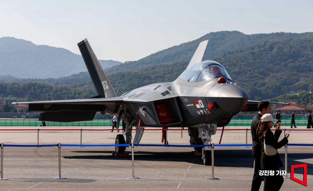 17일 경기 성남 서울공항에서 열린 '서울 국제 항공우주-방위산업 전시회(ADEX) 2023'에서 국산 초음속 전투기 KF-21이 공개되고 있다. 사진=강진형 기자aymsdream@