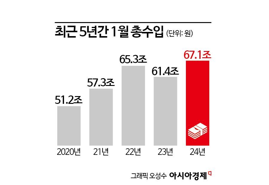 지난 1월 기준 총수입이 관련 통계가 작성된 이래 최대 수준인 67조1000억원을 기록한 것으로 나타났다. 소비 증가로 부가세와 보험료 수입 등이 늘면서 기금 수입도 많이 증가한 데 따른 것이다. 나라 살림 사정을 나타내는 관리재정수지는 8조3000억원 흑자를 기록했다. 다만 이는 계절적 특성에 따른 것으로 다음 달부터는 적자로 돌아설 가능성이 높다.