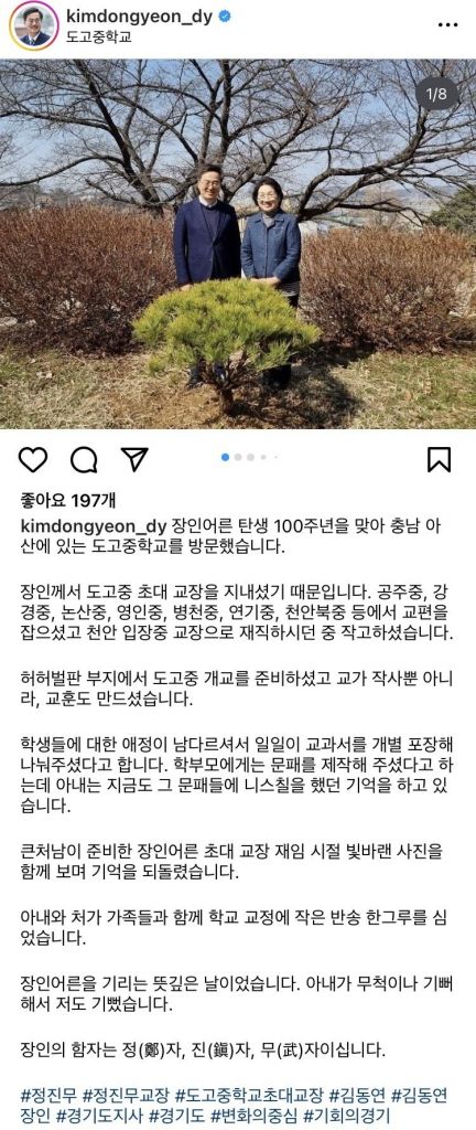 김동연 경기도지사가 장인어른이 초대 교장으로 재직했던 충남 도고중학교에 작은 반송 한 그루를 심었다며 올해로 탄생 100년이 된 장인어른을 회고했다.