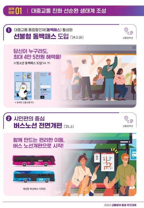 시는 이번 캠페인을 통해 ▲누구든지 사용이 가능한 '선불형 동백패스' 출시 ▲시민편의 중심의 버스노선 전면 개편 ▲다양한 교통수단을 하나의 플랫폼으로 연결하는 '부산형 MaaS사업' 등 3개 분야 8개 과제를 중점적으로 홍보하며, 시책 수혜 대상인 시민들과 적극적으로 소통할 계획이다.