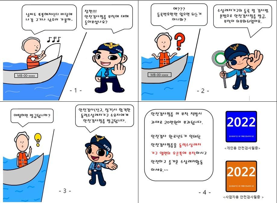 제주해양경찰서(서장 소병용)는 만화로 만나는 수상레저안전 4번째 이야기 ‘동력수상레저기구 안전검사필증 부착 의무화’를 제작·배포했다고 18일 밝혔다.