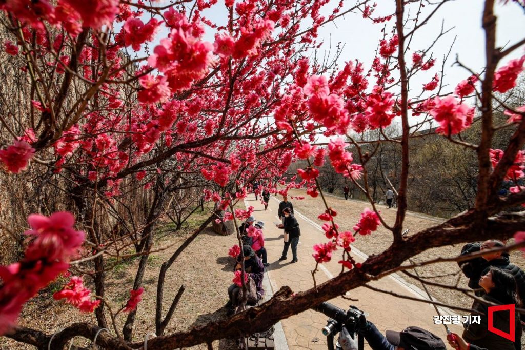 한 낮 기온이 13도까지 상승하며 완연한 봄 날씨가 이어지고 있는 18일 서울 성동구 청계천에 활짝핀 매화가 시민들의 시선을 끌고 있다.