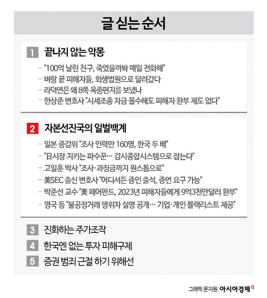 미공개정보 이용, 부정거래, 시세조종, 보고의무 위반 등 각종 불공정 거래와 관련해 다양한 관점에서 집중적으로 보도할 예정입니다. 자본 시장 범죄 근절을 위한 종합 대응 방안 마련을 위해 노력하겠습니다. 제보(lsa@asiae.co.kr) 부탁드립니다. 끝까지 취재해 보도하겠습니다.