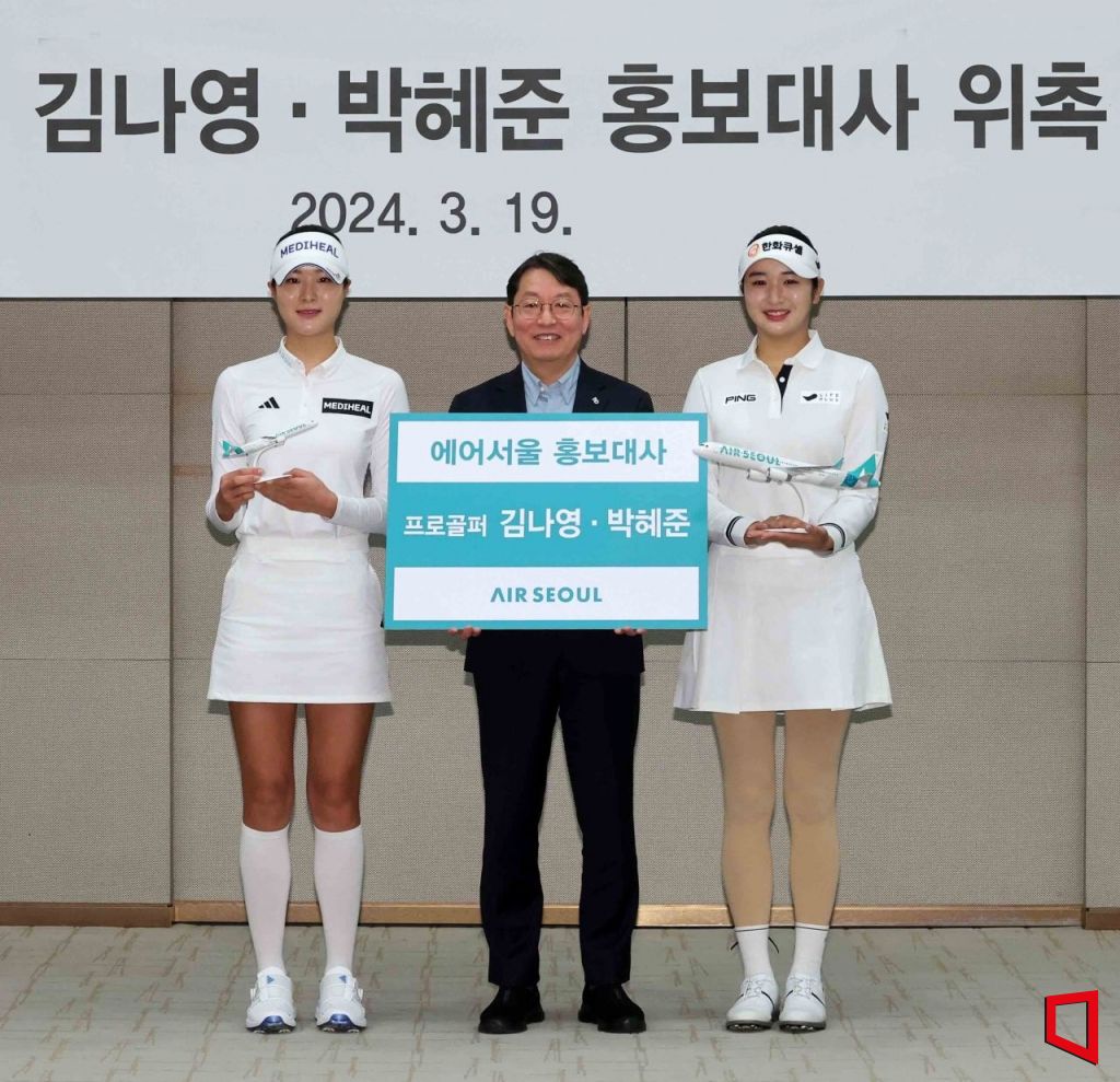 에어서울은 도전정신과 열정으로 한국 여자프로골프 대표 유망주로 빠르게 발돋움하고 있는 두 선수의 모습이 2016년 출범 후 9년만에 한국 대표 LCC로 자리잡아가고 있는 에어서울의 브랜드 이미지와 가치에 부합한다고 판단, 1년간 함께 활동하기로 했다고 밝혔다. 두 선수는 에어서울의 민트색 CI를 유니폼 한쪽에 새기고 1년간 경기에 출전하게 되며, 에어서울은 두 선수에게 에어서울이 운항하고 있는 전 노선의 항공권을 지원할 예정이다. 사진=공항사진기자단