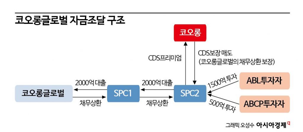 코오롱은 코오롱글로벌의 신용도 보강을 위해 ABL과 ABCP 투자자들과 CDS 계약을 체결했다. 코오롱이 코오롱글로벌의 채무 상환에 문제가 생기면 대신 책임을 지기로 하고 이에 대한 대가로 CDS 계약 프리미엄(일종의 수수료)을 받는 방식이다. 코오롱이 건설 자회사에 보증을 서주고 보증 수수료를 받은 격이다.