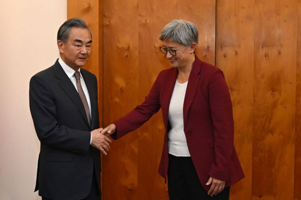 호주를 방문한 왕이 중국 외교부장(왼쪽)이 20일 캔버라 연방하원에서 페니 웡 호주 외무장관과 만나 악수하고 있다. [이미지출처=EPA연합뉴스]