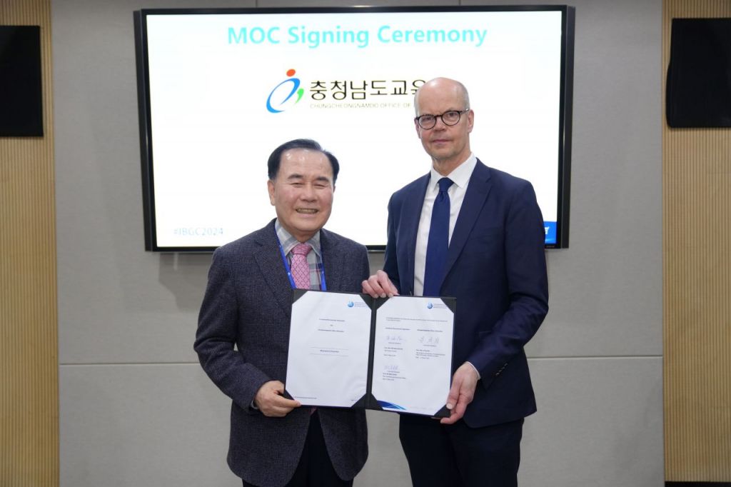 김지철 충남교육감은 이날 대구 엑스코 컨벤션센터에서 IBO 올리 페카 헤이노넨(Olli-Pekka Heinonen) 사무총장과 협력각서를 체결하고, 상호 협력하기로 했다.