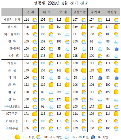 산업연구원은 11~15일 136명을 상대로 전문가 서베이 지수(PSI)를 조사한 결과 4월 제조업 업황 전망 PSI가 114로 4개월 연속 100을 넘겼다고 24일 밝혔다.