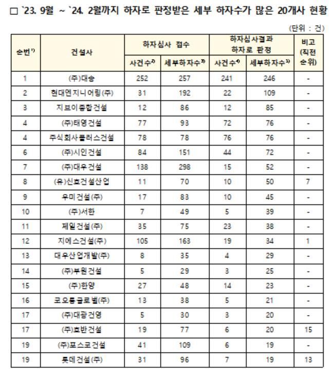 24일 국토교통부는 하자심사분쟁조정위원회(하심위)에 신청된 하자처리 현황 및 '하자 판정 건수 상위 20개 건설사 명단'을 공개했다.