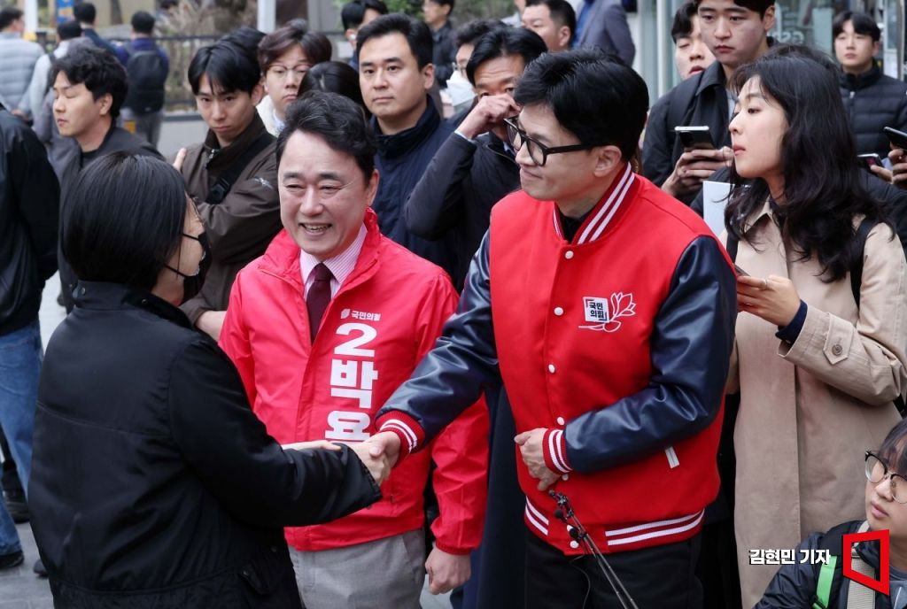 한편, 한 위원장은 이날 총괄 선거대책위원장을 맡은 이후 처음으로 출근길 인사를 진행했다. 빨간 점퍼를 입은 한 위원장은 서울 영등포구 여의도역에서 이날 오전 8시부터 약 20분간 출근하는 시민들에게 '90도 인사'를 건넸다. 약간은 어색한 듯 두 손을 모은 채 한 위원장은 영등포을에 출마한 박용찬 후보가 인사를 하기 위해 고개를 숙이면 따라서 고개를 숙였다.