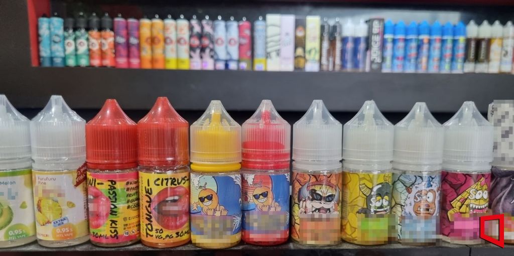 한 전자담배 매장 안에 화려한 포장지로 이목을 끄는 전자담배 액상통이 진열돼 있다.[사진=심성아 기자]