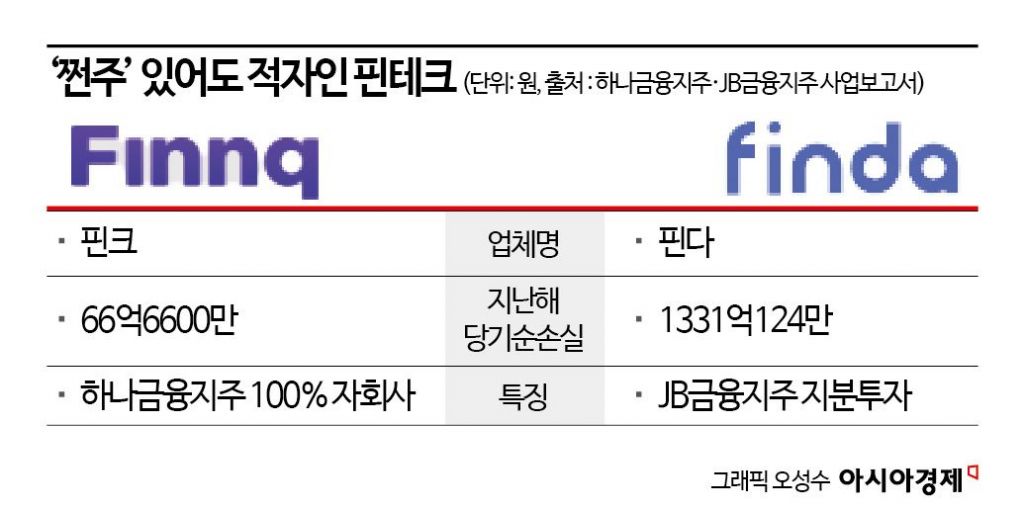 금융지주사가 전략적으로 투자한 핀테크 업체도 사정은 마찬가지다. 지난해 7월 핀다는 JB금융지주로부터 470억원 규모의 투자를 받았다. 당시 핀다의 누적 투자금은 644억원으로, JB금융지주의 투자 규모는 전체 투자금의 약 73%를 차지했다. 핀다는 지난해 당기순손실 1331억2400만원을 기록했다. 지난해 신규대출 건수가 감소하는 등 매출이 줄었으나 인건비 등 지출도 함께 감소해 손실을 최소화했다고 핀다 측은 설명했다.