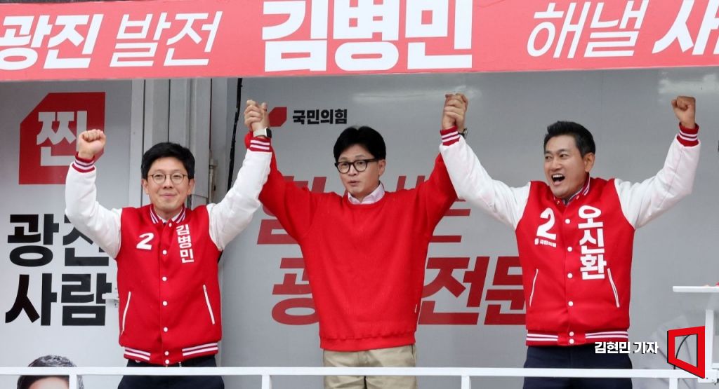 한동훈 국민의힘 비상대책위원장 겸 총괄선거대책위원장이 28일 서울 광진구 신성시장에서 오신환 후보, 김병민 후보와 함께 지지를 호소하고 있다. 사진=김현민 기자 kimhyun81@