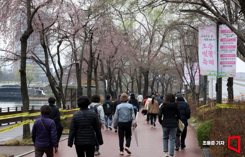 석촌호수 벚꽃축제가 열리고 있는 28일 서울 송파구 석촌호수 주변 벚나무들이 개화가 더디면서 축제장을 찾은 시민들이 벚꽃 없는 축제를 보고 있다. 31일까지 석촌호수 일대에서 벚꽃 축제가 열린다. 사진=조용준 기자 jun21@