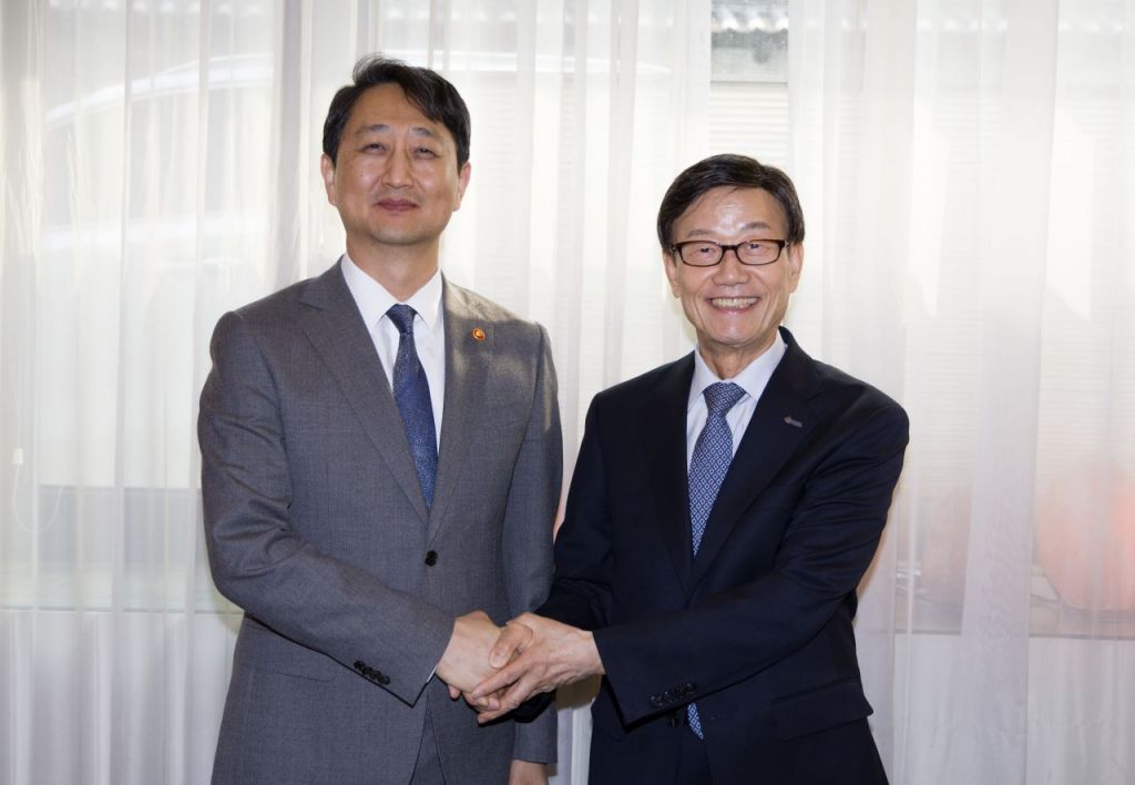 지난달 29일 윤진식 한국무역협회 회장(오른쪽)이 취임 후 첫 행보로 안덕근 산업통상자원부 장관과 면담하고 있다. 두 사람은 올해 수출 7000억 달러 달성을 위해 협력하기로 했다.[사진출처=연합뉴스]