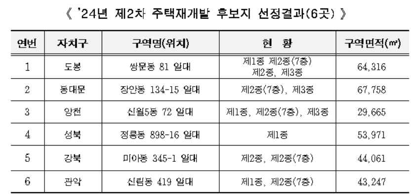 선정된 6곳은 ▲도봉구 쌍문동 81 일대 ▲동대문구 장안동 134-15 일대▲양천구 신월5동 72 일대 ▲성북구 정릉동 898-16 일대 ▲강북구 미아동 345-1 일대 ▲관악구 신림동 419 일대다.