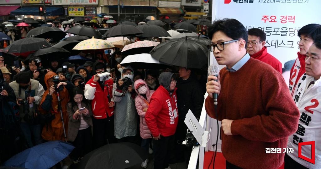 한동훈 국민의힘 총괄선거대책위원장이 29일 서울 영등포구 영진시장에서 김영주, 박용찬 후보와 함께 지지를 호소하고 있다. 사진=김현민 기자 kimhyun81@ 사진=김현민 기자 kimhyun81@