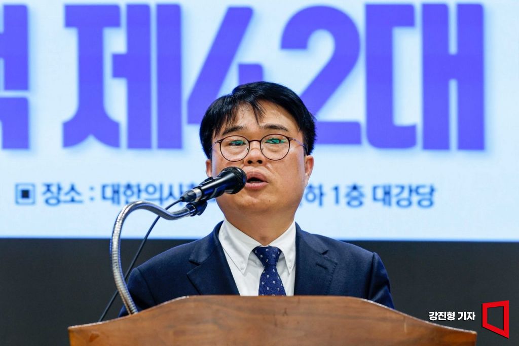 임현택 대한의사협회 회장 당선인이 29일 서울 용산구 대한의사협회에서 기자회견 하고 있다.