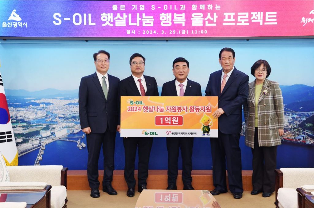 S-OIL은 29일 울산시청에서 김두겸 시장, S-OIL 김보찬 울산 Complex Head, 김석원 울산시자원봉사센터 이사장이 참석한 가운데 ‘햇살나눔 자원봉사 프로그램 사업비’를 울산시자원봉사센터에 전달했다고 알렸다.