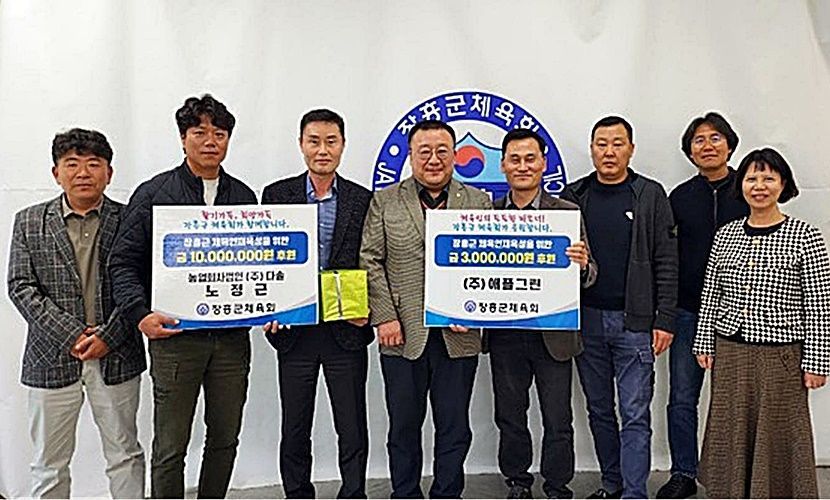 전남 장흥군체육회(회장 정성인)는 지난 28일 ㈜다솔과 ㈜애플그린에서 지역 체육 인재 육성을 위해 각각 1000만원과 300만원을 기탁했다고 29일 밝혔다.