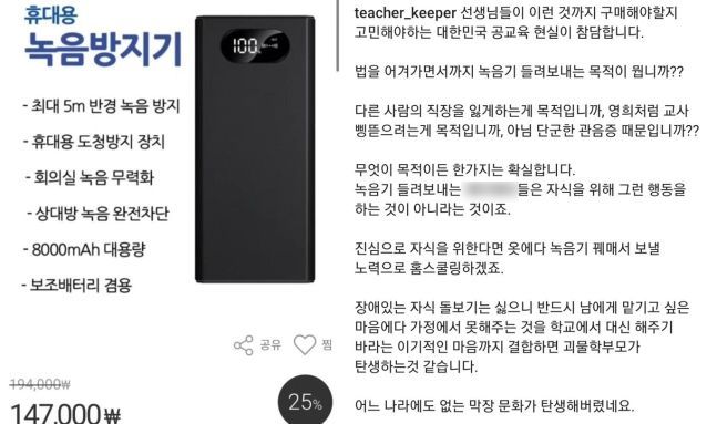한국교원단체총연합회는 29일 논평을 내고 "해당 소송 건에 대해 수원지방법원이 몰래 녹음을 증거로 인정했을 때 교실을 불법 녹음장으로 전락시키는 판도라의 상자가 열린 것"이라며 "법을 어기면서 자녀 몰래 녹음기를 들려 보내는 학부모가 늘고, 교사는 불안한 마음에 자신을 지키기 위해 녹음방지기를 사는 '막장교실'이 부끄럽고 참담하다"고 했다.