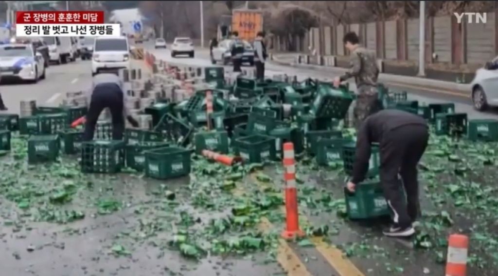 29일 YTN은 전날 오후 2시께 경기 시흥시 목감동의 한 도로에서 맥주를 운반하던 트럭 문이 열려 맥주병 수백 개가 도로에 쏟아지는 사고가 발생했다고 보도했다. 깨진 맥주병으로 인해 도로는 순식간에 초록색 유리 조각으로 뒤덮였다. 이 때문에 경찰관들은 도로를 통제하는 등 극심한 차량 정체가 예상되는 상황이었지만 이곳을 지나던 수도방위사령부 솔개부대 장병 15명이 팔을 걷어붙이고 나서 현장은 금방 정리될 수 있었다.