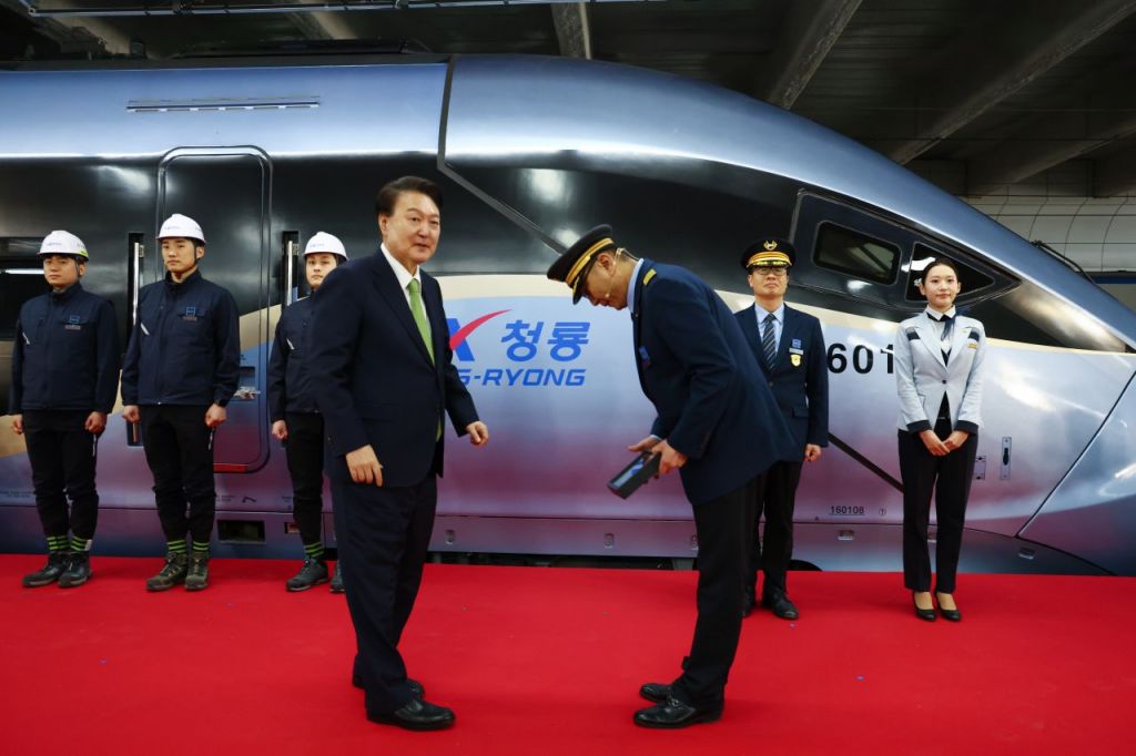 윤석열 대통령이 1일 대전역에서 열린 차세대 고속열차 명명식에서 이재욱 KTX 기장에게 출무 신고를 받고 있다. / 사진제공=대통령실통신사진기자단