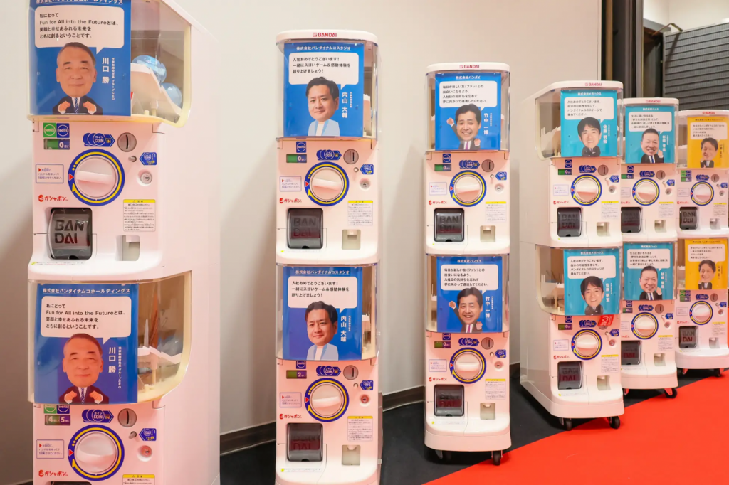 반다이남코 신입사원을 맞이하기 위해 마련된 가챠 자판기들. 각 계열사 사장들의 격려사를 넣어 만들었다.(사진출처=반다이남코)