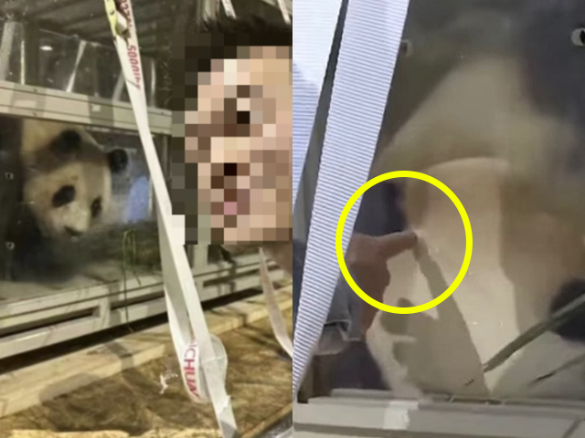 마스크 안 쓴 취재진이 케이지 앞에서 푸바오와 찍은 사진(좌), 공항에 도착한 푸바오를 관계자가 손으로 찌르는 모습(우). [이미지출처=웨이보, 신화사 유튜브 캡처]