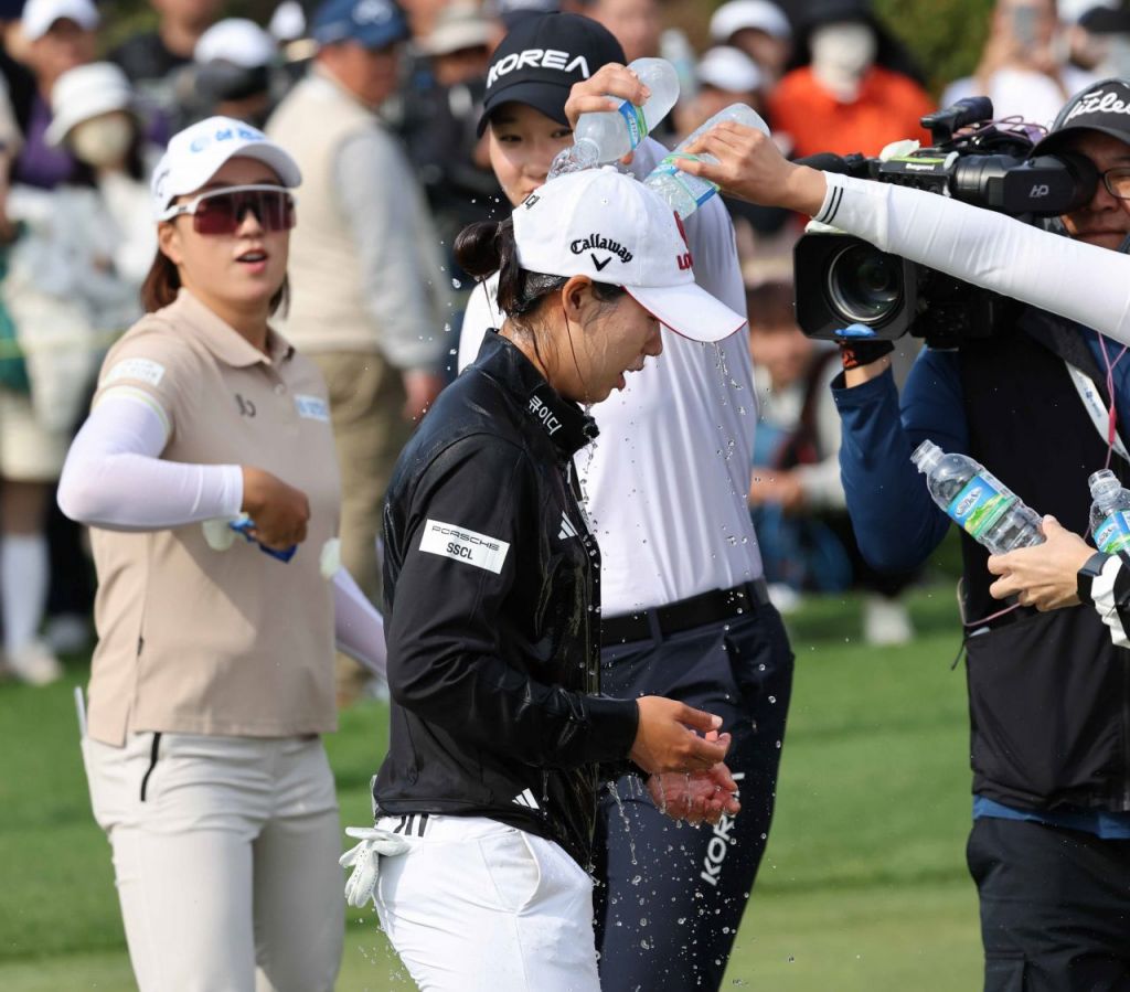 황유민이 두산건설 위브 챔피언십 우승 직후 축하 물세례를 받고 있다.[사진제공=KLPGA]
