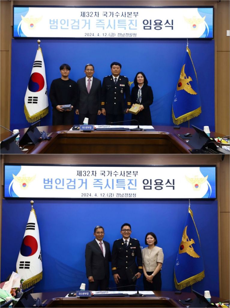 경남경찰청은 12일 오후 국가수사본부장이 도 경찰청을 방문해 도경 형사기동대 김정호, 양산서 지능팀 권효진 경위에게 특진 임용장을 전했다고 밝혔다.