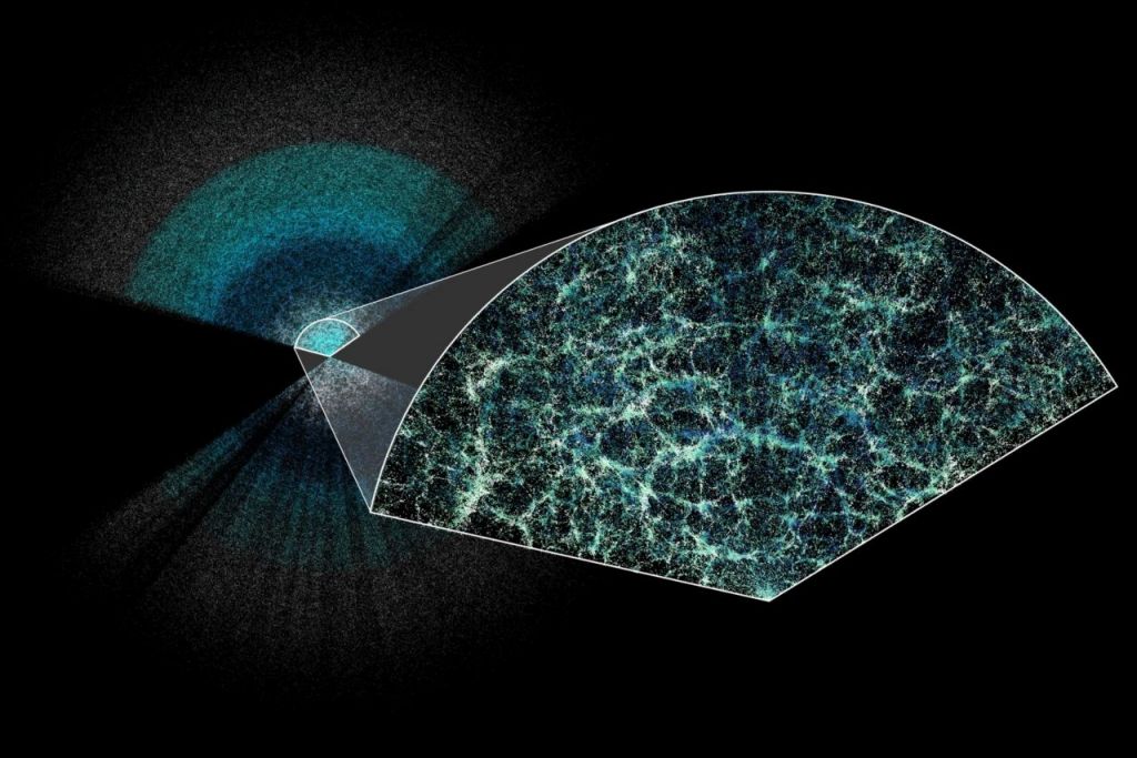 DESI 연구진이 만든 약 600만 개의 은하와 퀘이사의 거리와 방향이 찍혀 있는 우주의 3차원 지도. 적경 190도, 적위 14도에 이르는 하늘의 좁은 부채꼴 모양의 관측 자료로서 우리은하가 중심에 있다. 중심으로부터의 거리는 DESI가 관측한 적색이동에 해당한다. 이 중 적색이동된 약 27억 광년 안쪽의 모습을 확대한 큰 지도에는 중입자음향진동의 패턴인 여러 개의 공 모양이 선명히 보인다. (출처: DESI)