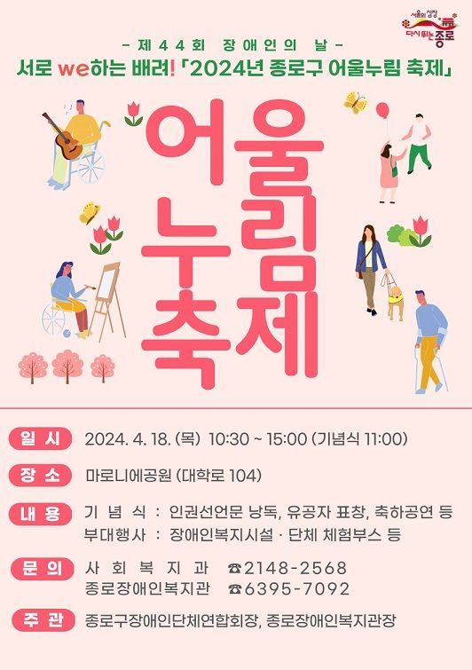 서울 종로구(구청장 정문헌)가 장애인의 날을 기념해 오는 18일 10시 30분부터 마로니에공원(대학로 104)에서 ‘서로 we하는 배려! ‘2024년 종로구 어울누림 축제’를 개최한다.