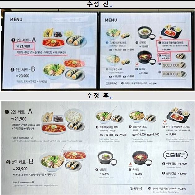 16일 공항 공사는 설명자료를 내 "이 업체의 2인 세트 메뉴는 각각 구매하는 메뉴와 분량 차이가 있는 것으로 확인됐다"면서 "다만, 메뉴판의 세트 메뉴 사진으로 단품과 동일한 사진을 사용해 분량 차이에 대한 설명이 미흡했다"고 말했다. 이어 "공사는 이날 해당 업체가 세트 메뉴에 대한 상세한 분량 표시 등 메뉴판을 수정한 것을 확인했다"고 말했다. 실제로 수정된 메뉴판에는 2만1900원인 세트 A의 설명에 '떡볶이 1.5인분', 국물 떡볶이 세트에 '떡볶이 1인분'이라는 설명이 추가됐다. 세트 A의 구성품이던 어묵 2개도 어묵 4개로 수정됐다.