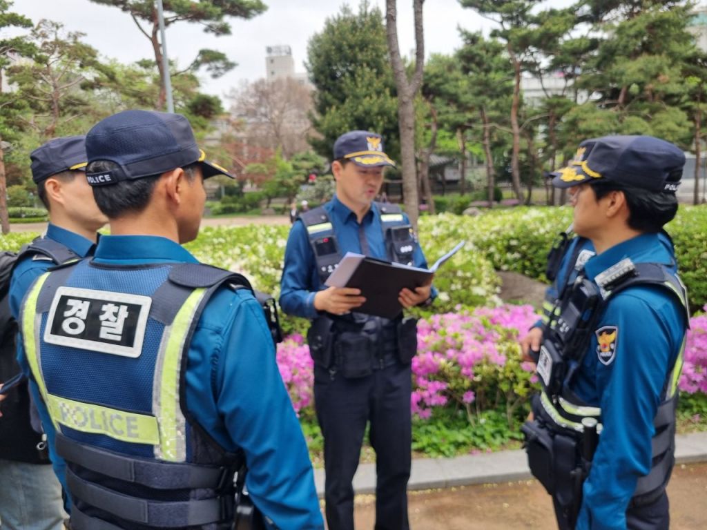 16일 오후 1시께 서울 종로구 탑골공원에서 김용혁 서울 기동순찰1대장이 순찰 업무에 대한 지시를 내리고 있다.[사진=심성아 기자]