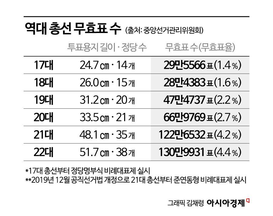 특히 준연동형 비례대표제가 처음 실시된 21대 총선에서는 정당 개수가 35개(48.1cm)로 대폭 증가했는데, 이 시점에 무효표 수가 67만표에서 123만표로 1.8배 수준이 됐다. 1~2%대를 유지하던 무효표 비율(전체 투표수 대비 무효표 수) 역시 21대 총선에서 4.2%로 뛰었다. 38개의 정당이 이름을 올린 이번 총선에서도 131만표의 무효표가 나와 역대 최다 기록을 경신했다. 이는 17대 총선 무효표(30만표)의 약 4배로, 의석 2개를 확보한 개혁신당 득표(103만표)보다도 많은 셈이다.