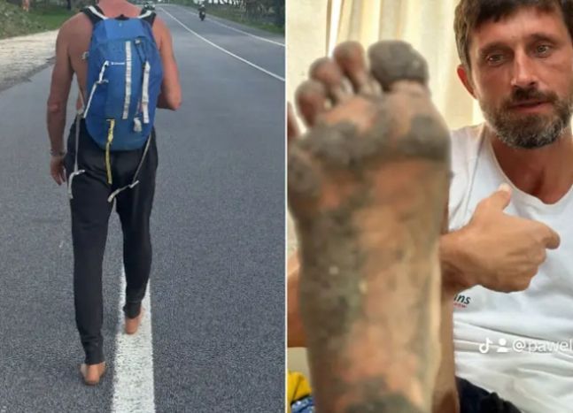 맨발로 프랑스에서 스페인까지 횡단하는 데 성공한 남성이 자신의 발바닥 상태를 공개했다. 그가 맨발로 걸은 거리는 약 3400㎞에 이른다. 기네스 세계기록은 최근 폴란드 출신 남성 파웰 듀라키에비츠(45)가 신발을 신지 않은 상태로 3409.75㎞를 걸어 세계 최장 맨발 여행 기록을 경신했다고 밝혔다.