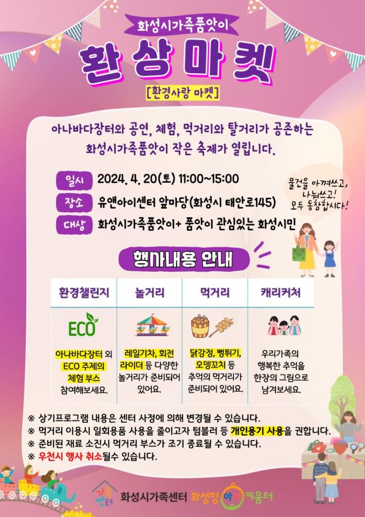 경기도 화성시는 지구의 날(22일)을 맞아 오는 20일 유앤아이센터 앞마당에서 미래 세대를 위한 환경 챌린지 '화성시 가족품앗이 환상마켓' 행사를 개최한다.