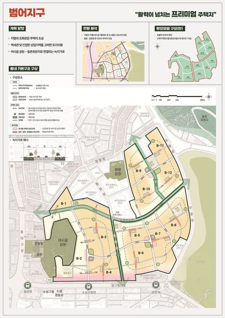 먼저, 범어지구는 ‘활력이 넘치는 프리미엄 주거지’로 조성하기 위해 지형과 조화되는 주택 유형을 배치했고, 야시골 공원에서 동촌유원지로 이어지는 녹지가로를 조성한다.