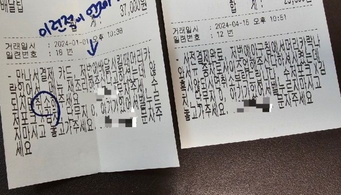 그런데 놀라운 것은 B씨의 무리한 요구가 이번이 처음이 아니라는 것이다. 지난 1월 1일에도 B씨는 동일한 수법으로 A씨의 가게에 주문을 넣었다. 당시 주문 전표를 보면, "저번에 아귀찜에서 머리카락이 나와서 중자로 사이즈업 해주신다고 하셨는데, 혹시 안 되면 취소 부탁드립니다"라고 적혀있다.