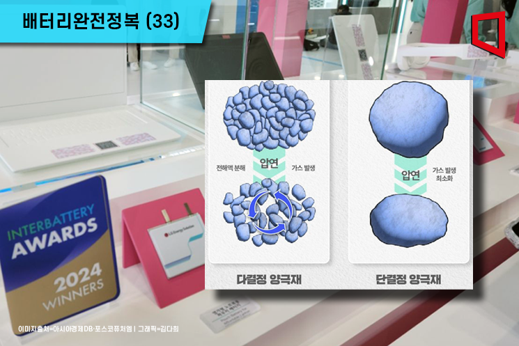 현재 리튬이온 배터리는 여러 개의 결정이 하나의 입자를 이루고 있는 다결정(Poly-Crystal) 양극재를 사용하고 있다. 다결정 양극재는 압연 공정에서 깨지기 쉽다. 특히 충전과 방전을 반복할수록 소재 사이에 균열이 발생하고 이 틈으로 전해액이 침투하면서 소재와 부반응을 일으키며 가스가 발생한다.