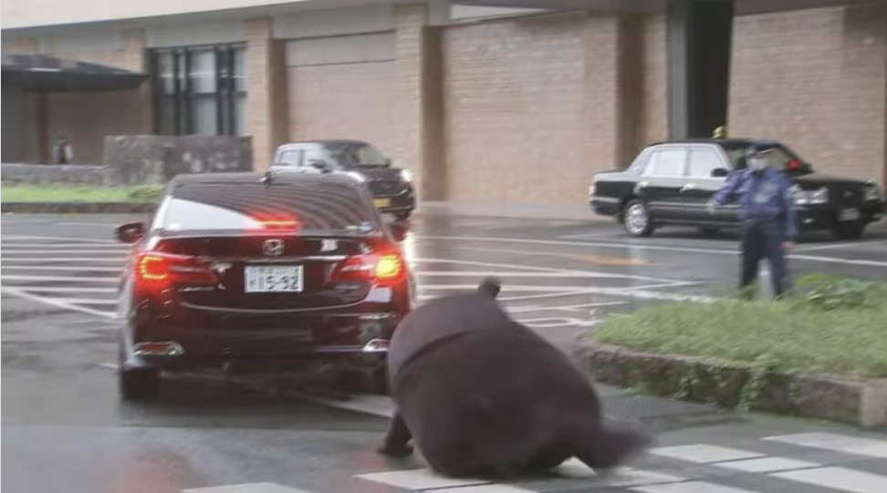 차를 타고 떠나는 가바시마 지사를 쫓는 구마몬.(사진출처=FNN)