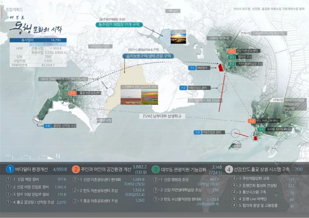 주요 사업은 ▲흘곶항 물양장 및 선착장 조성 ▲선감항 제방정비 ▲선감항·탄도항 어장진입로 정비 ▲탄도항 수산물직판장 리모델링 ▲3개 항 어촌공유센터 조성 등이다.