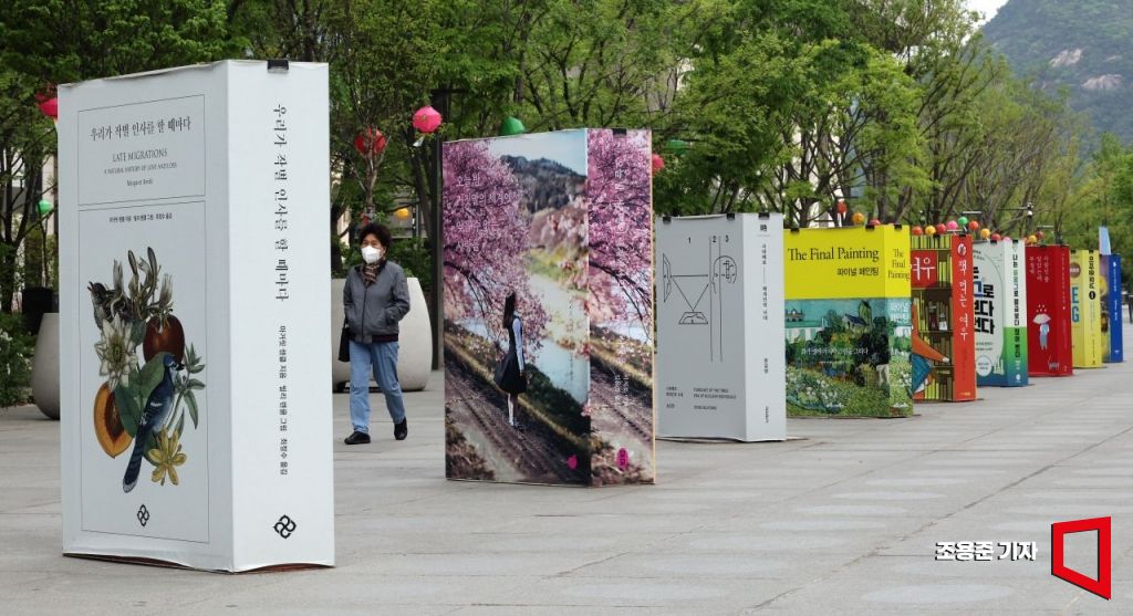 세계 책의날인 23일 서울 종로구 광화문광장에 한 문고에서 설치한 대형 책모형물 옆으로 시민들이 걸어 가고 있다. 사진=조용준 기자 jun21@