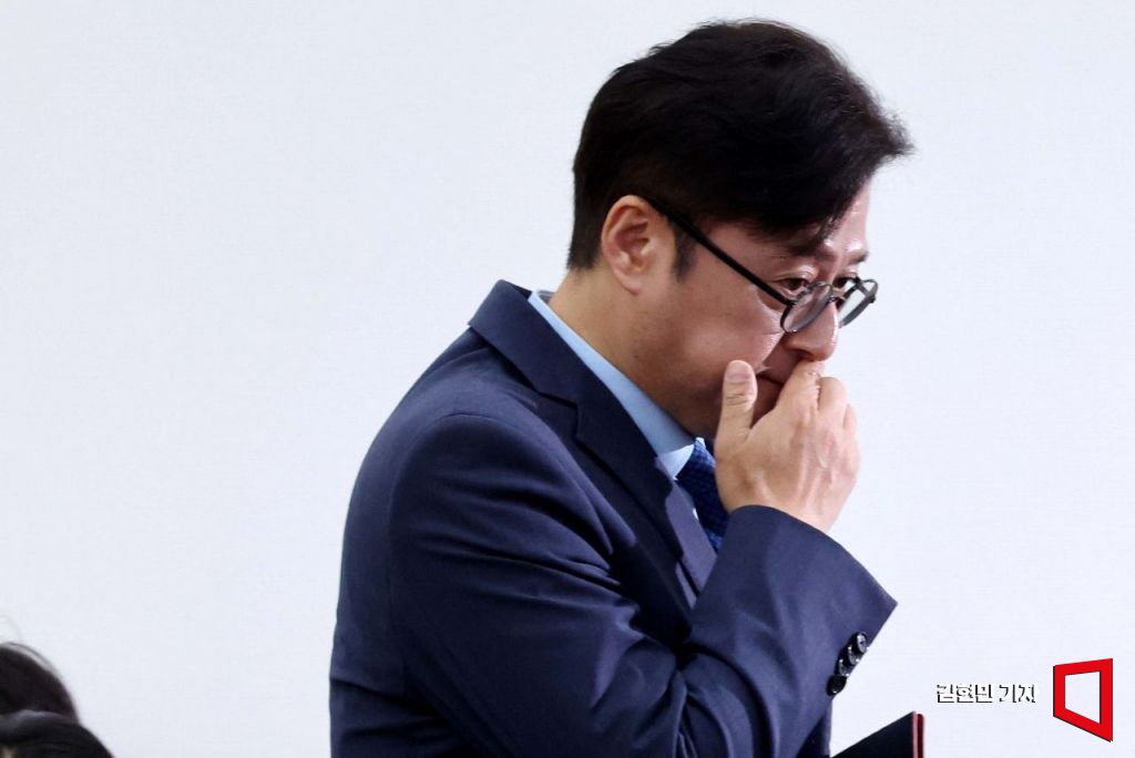 홍익표 더불어민주당 원내대표가 23일 국회에서 열린 원내대책회의에 참석하고 있다. 사진=김현민 기자 kimhyun81@