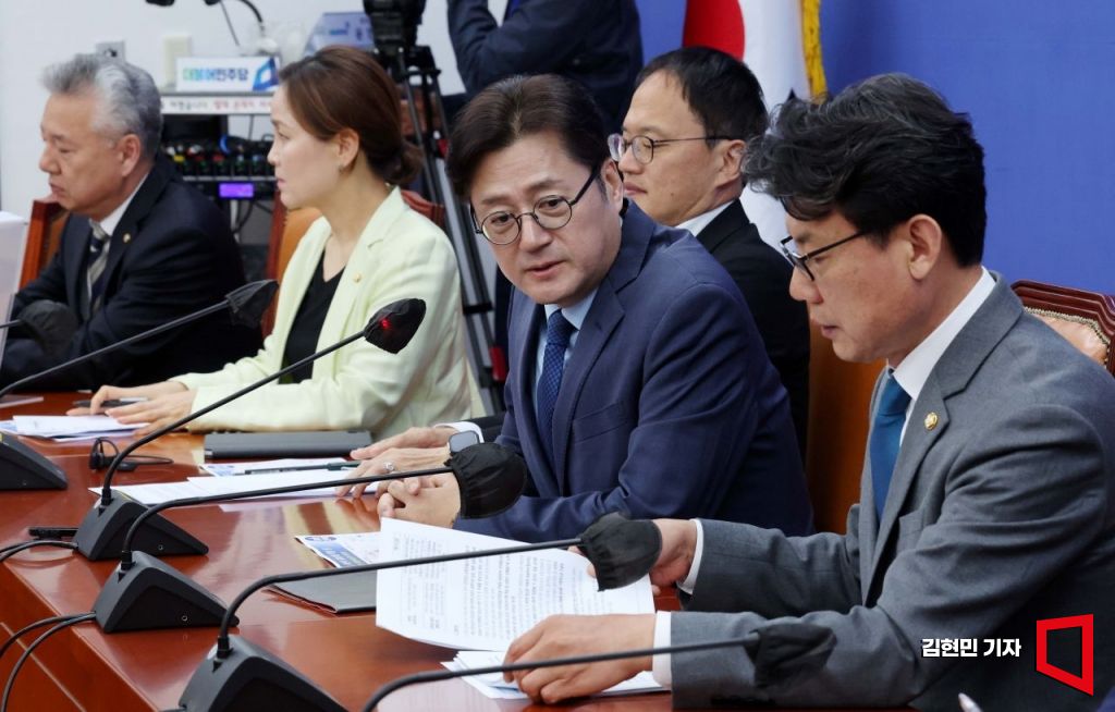 홍익표 더불어민주당 원내대표가 23일 국회에서 열린 원내대책회의에서 발언하고 있다. 사진=김현민 기자 kimhyun81@