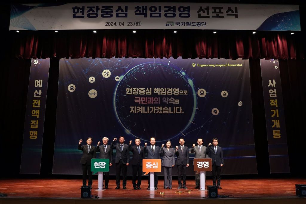 국가철도공단은 23일 대전 본사에서 이성해 철도공단 이사장과 전 임직원이 참석해 현장 중심의 책임경영을 약속하는 선포식을 가졌다고 밝혔다.