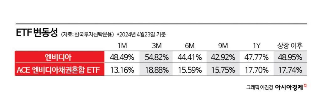 한국투자신탁운용에 따르면 엔비디아의 지난해 연간 변동성은 47.05%다. 반면 국내 상장 ETF 가운데 엔비디아 비중이 가장 높은 ACE 엔비디아채권혼합 ETF 변동성은 18.34%에 불과하다.