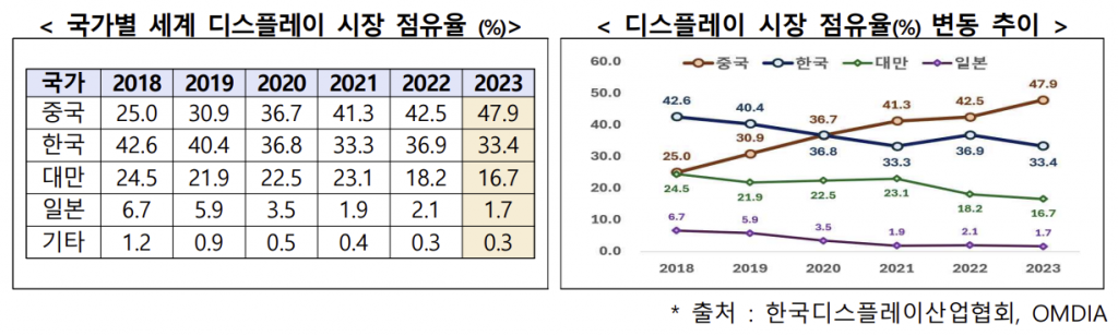 지난해 국내 디스플레이 업계 매출액은 전년 대비 13.4% 줄어든 389억달러였다. 세계 경기 둔화와 중동 사태 등의 IT 수요 불확실성이 커진 데다 국내 기업의 LCD 사업 축소 및 중국 기업의 OLED 시장 진입 확대 등에 따른 경쟁 심화가 영향을 미쳤다. 이로 인해 지난해 세계 디스플레이 시장에서 2위를 차지한 한국 시장 비중은 33.4%로 전년 대비 3.5%포인트 줄었다.